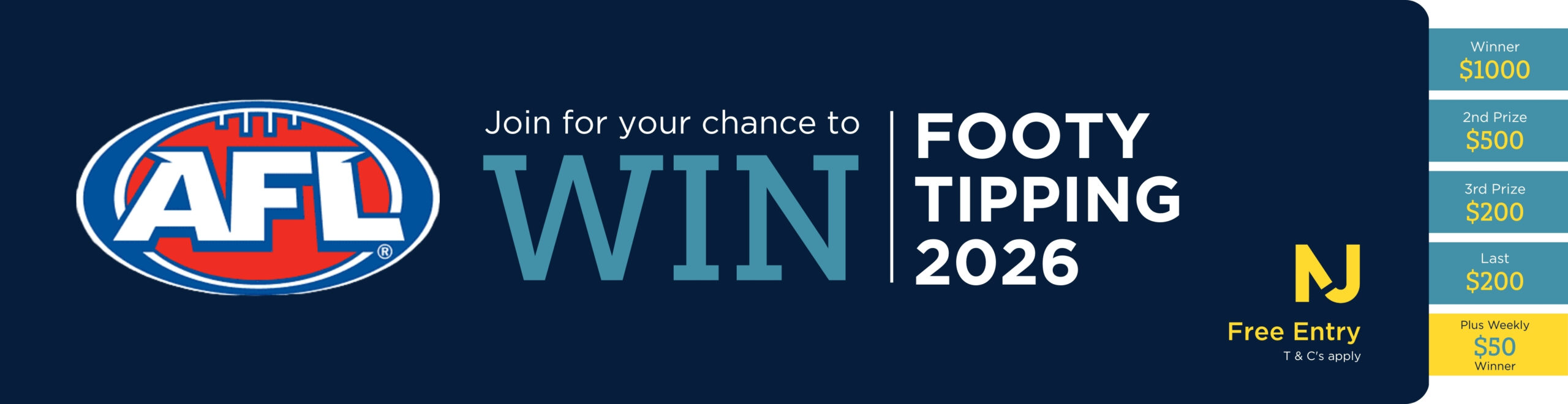 Noel Jones Corporate is pleased to present the Noel Jones 2026 Footy Tipping Competition. The competition is open to Victorian residents only.